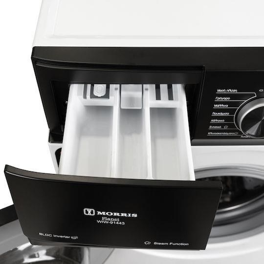 Η λειτουργία ατμού του πλυντηρίου ρούχων Morris WIW-91443 επιτυγχάνει σε μεγάλο ποσοστό αποστείρωση των ρούχων, ενώ παράλληλα εξουδετερώνει τις οσμές. Χρησιμοποίησε τον ατμό για υψηλότερη απόδοση πλυσίματος, ειδικά στα προγράμματα χαμηλών θερμοκρασιών.